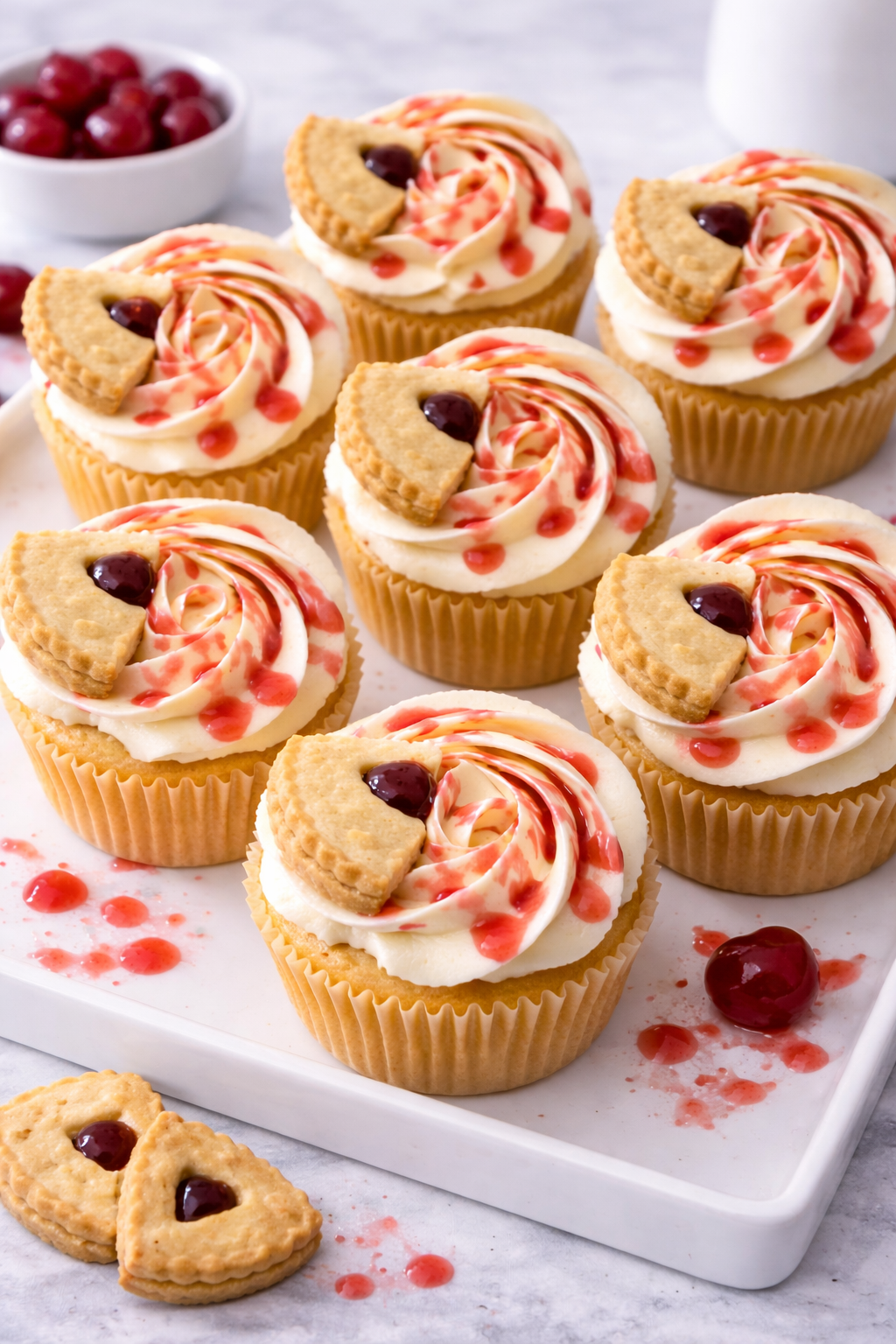 Soft and fluffy cherry cupcakes filled with sweet cherry sauce and topped with smooth frosting. Freshly baked and available in gluten-free, vegan, dairy-free, and vegan gluten-free options—perfect for any celebration.